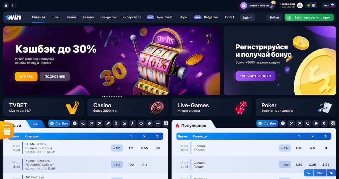 Букмекер 1Вин – проверенная временем контора, где каждый посетитель найдет развлечение. Основным направлением деятельности компании являются ставки на спорт. Игроки могут заключать предварительные пари, ставить на классические и необычные дисциплины. Если первые – это футбол, хоккей, баскетбол и другие подобные виды спорта, то ко вторым можно отнести киберспорт, скачки и еще с десяток вариантов.